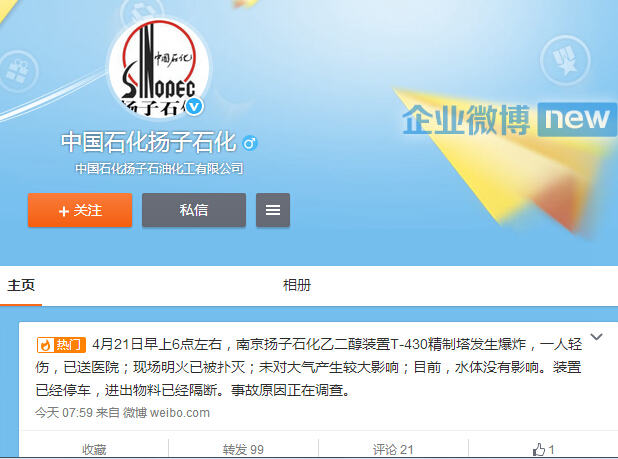 4月20日晚6點31分,南京市安監局也在官方微博上通報了該督查信息 人民網南京4月21日電 (朱殿平)今天早晨6時07分,位於南京市六合區的揚子石化發生爆炸。據官方通報,發生爆炸的是廠區內的乙二醇裝置T-430精制塔。有網友留意到,就在前一天,4月20日江蘇省安監局、南京市安…