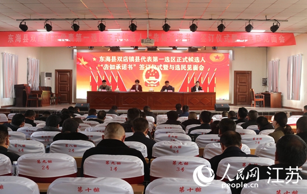 選區召開正式候選人“告知承諾書”簽訂儀式暨與選民見面會。東海縣委宣傳部供圖 “徐艷波同志,如果你當選人大代表,你將如何為民進言?”“我將經常深入選區,聽取和收集廣大選民的意見和建議,並及時向各級黨委政府反映大家的意見、建議。另外,對大家普遍反映的熱點、難點問題,將以議案和建議…