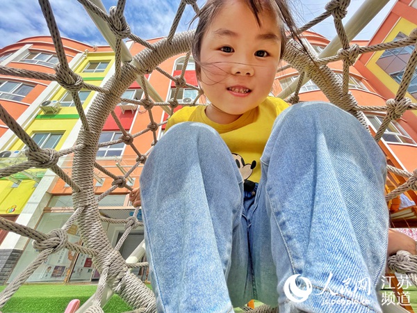 五裡鎮幼兒園的孩子體驗全新的游樂設施。人民網 馬燾燾攝