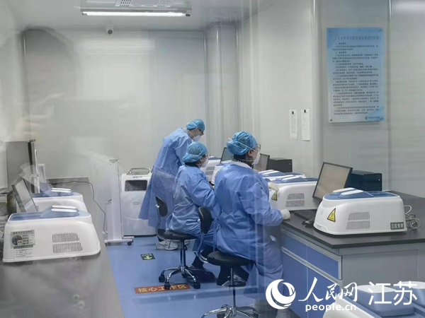 3月8日凌晨2時許,江蘇省東海縣中醫院檢驗科PCR實驗室內燈火通明,一名名檢驗人員依舊“全副武裝”,有序地對新冠病毒核酸檢測樣本進行檢測。
