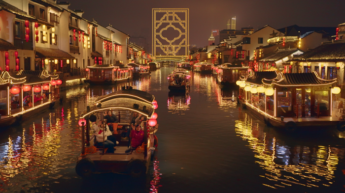 在總台春晚的四個分會場中,無錫是唯一一個全水路串聯的城市。“舞台”從燈火璀璨的古運河,延伸至寬廣遼闊的太湖、滾滾東逝的長江,將“水韻無錫”表現得淋漓盡致。為了讓江南文化的特質能被游客觸達,“水”在今年的迎新春活動中扮演起重要的角色。