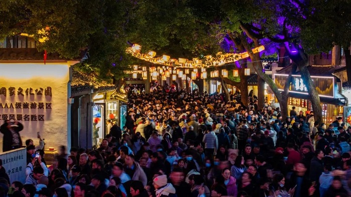 在總台春晚中出鏡的拈花灣和窯湖小鎮,今年春節的夜游項目豐富多彩,“夜游+民宿”的組合成為景區的新質生產力,整個春節長假期間客房預訂率超過95%。