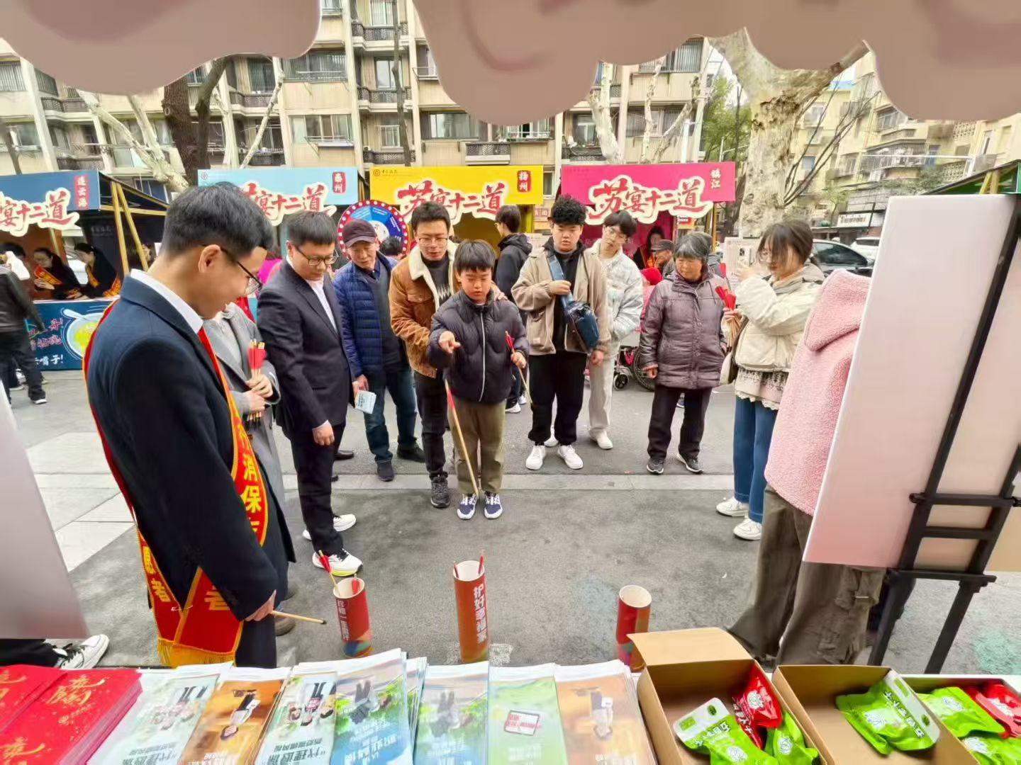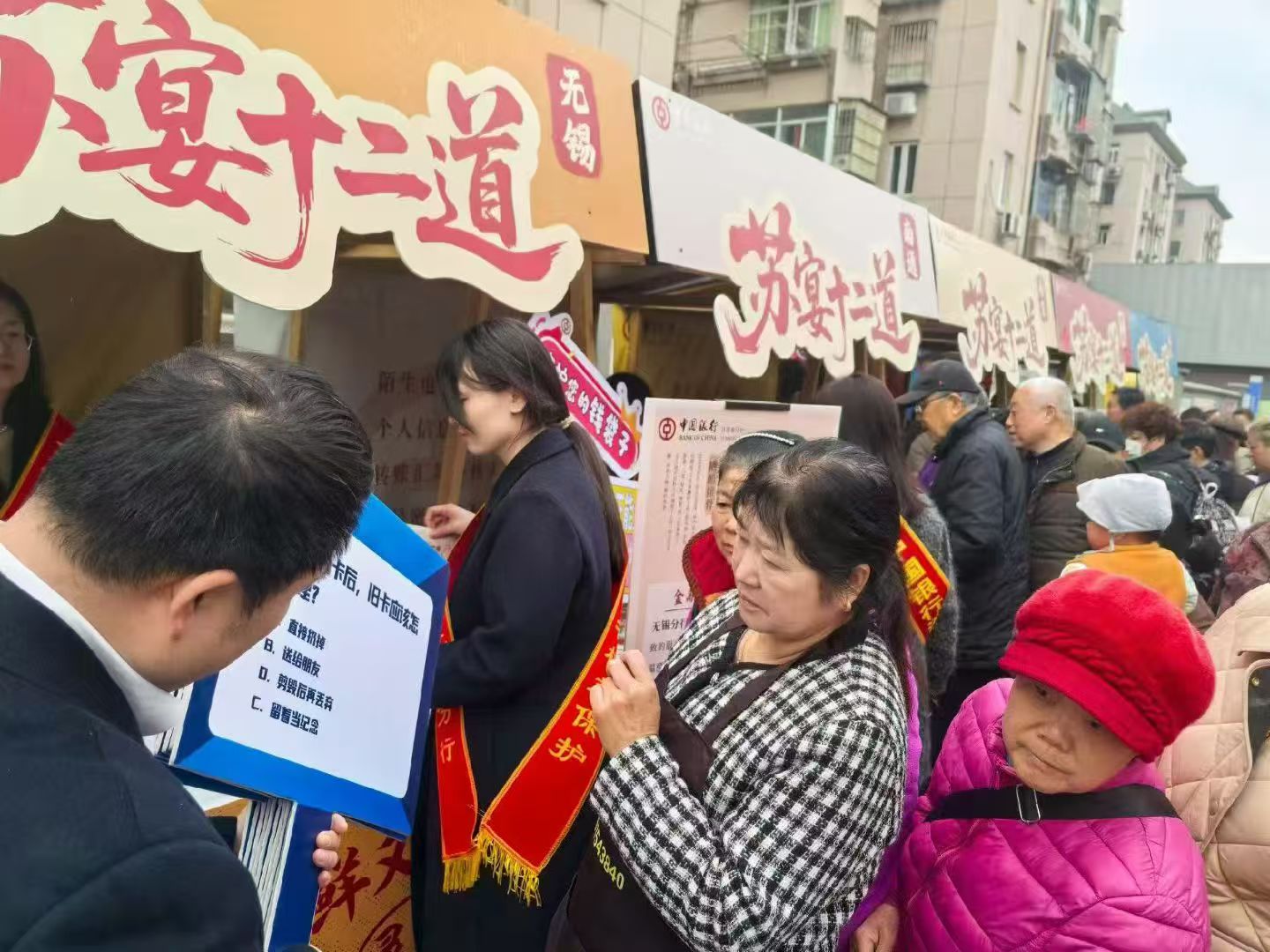 活動現場,七大主題區域各具特色,金融知識與飲食文化深度交融:在 “金融驛站” ,外賣員、網約車司機等新業態勞動者成為主角。工作人員用一分鐘的真實案例講解,為“兩司兩員”群體定制反詐指南,實用手機支架和飲用水傳遞著城市的溫暖與關懷﹔“蘇宴十二道” 攤位前,各地特色“金融美食”展現在市民眼前,市民答題互動,在舌尖上“品鑒”江蘇中行轄內各分行的金融消保為民工作亮點。