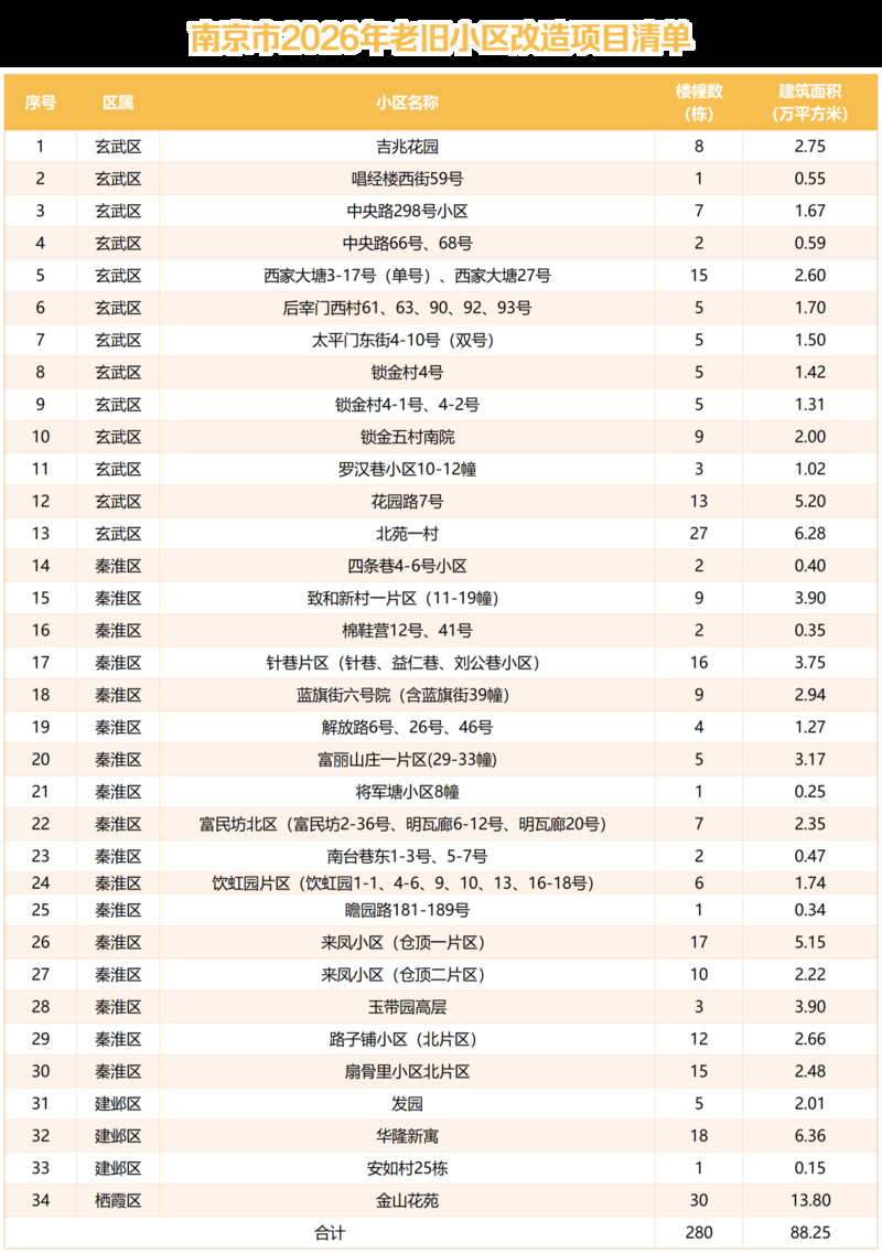南京34個小區即將原地升級!3月23日,南京市發布2026年度老舊小區改造計劃,全市34個老舊小區納入改造清單,覆蓋玄武、秦淮、建鄴、棲霞等多個片區。改造將專注補短板、優配套、提品質、美環境,讓老房子住出新質感,讓居民生活更舒心、更安心、更省心。