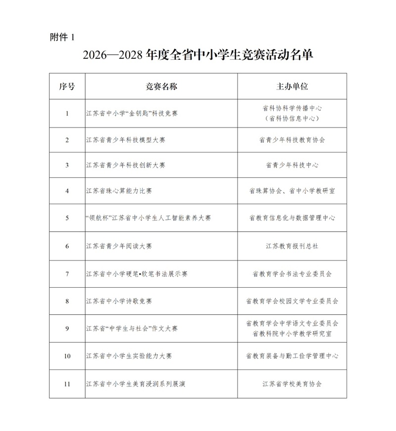 3月25日,江蘇省教育廳公布2026—2028年度全省中小學生競賽活動名單和江蘇省中小學生參加的全國競賽活動名單。其中,2026—2028年度全省中小學生競賽活動名單包括江蘇省中小學“金鑰匙”科技競賽等11項競賽活動,江蘇省中小學生參加的全國競賽活動名單包括全國青少年人工智能創新挑戰賽等47項競賽活動。