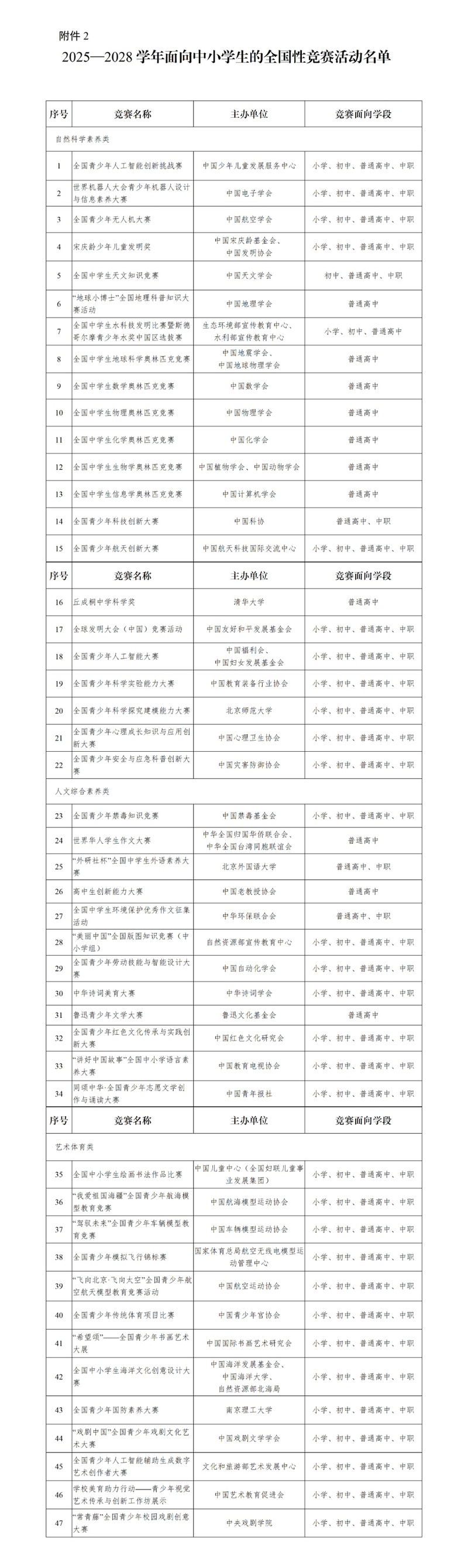 其中提及,未經省教育廳批准,任何單位不得擅自組織面向中小學生的全省性競賽活動,各地各校不得組織或動員中小學生參加不在公布名單內的各類競賽活動。除教育部有文件要求外,原則上不以省為單位統一組織中小學生參加其他全國性的競賽活動。