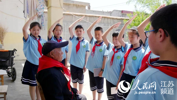 赣榆区城头小学队员们向91岁革命前辈范爷爷敬礼。赣榆县委宣传部供图 为学习贯彻全市党史学习教育巡回指导组汇报会工作要求,连云港市赣榆区深入挖掘和充分用好红色资源,打造红色阵地,讲好红色故事,厚植红色基因,不断擦亮赣榆红色文化名片,推动党史学习教育入脑入心。 连点成线、串珠…