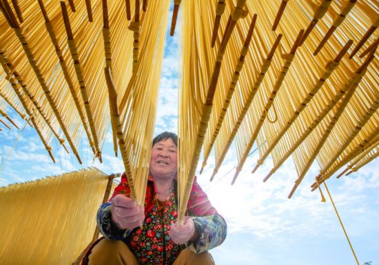 昨日,洪泽区朱坝街道袁集村村民在晾晒手工挂面。该村是远近闻名的手工挂面制作专业村,近年来,村党支部采用“党支部+合作社+农户”模式,实现集中经营、农户抱团发展、农产品规模生产,走出一条拉动村集体经济和村民“双增收”的新路径。 ■通讯员 周太松…