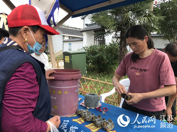 图为金秋水产丰收节集市上正在扎螃蟹的商户 顾姝姝摄