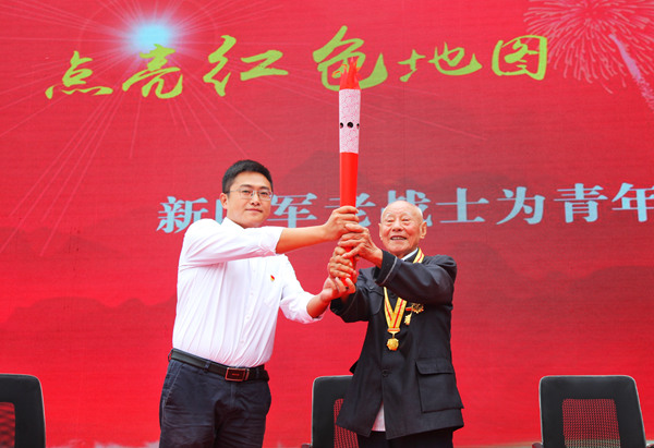 活动现场,94岁高龄的新四军老战士张德夫把“红色火炬”传递给六合区竹镇“优秀共产党员”彭骏。