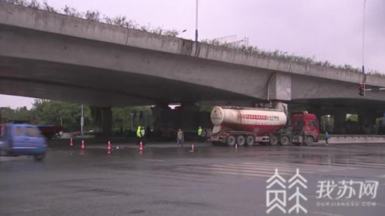 据目击者说,下午三点20左右,在江海大道高架下方的这个十字路口,一辆槽罐车由西向东直行,一辆电动车同方向行驶,准备左拐向北,两车在路口相撞。电动车连车带人被压在槽罐车左前侧车轮下。“这辆槽罐车直接开着斜过来了 ,一点刹车印都没有。”