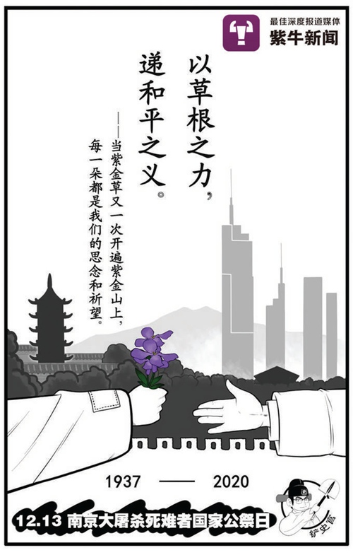 今年12月13日是第七个国家公祭日,来自北京的漫画创作团队每年今日推出的国家公祭日漫画又如约而至。今年的漫画给大家讲述了日本人山口诚太郎与“紫金草”的故事。2017年国家公祭日,该团队以其创作的两名女孩穿越历史隔空相对的漫画爆红,此后每年12月13日,他们都会推出纪念国家公祭日的漫画作品,唤起人们对和平的向往和坚守。 扬子晚报/紫牛新闻记者 张楠