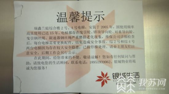 记者现场看到,停运的电梯上2020年6月份就张贴了提示:内容显示瑞鑫兰庭综合楼2号、4号电梯,安装于2005年,因使用频率高且使用已经达15年,电梯存在零部件老化问题,为避免事故发生,已做停梯处理。