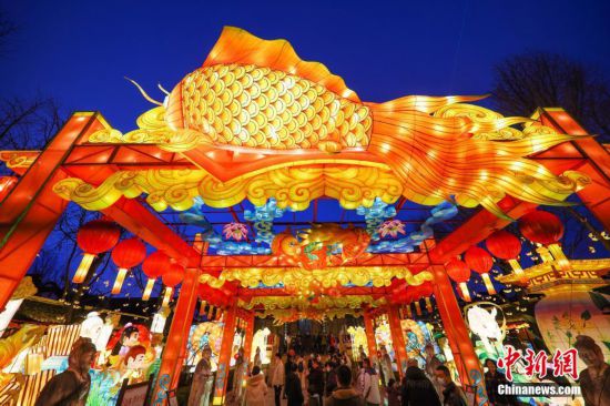 2月15日晚,民众在南京夫子庙大成殿内赏灯。春节假期,南京秦淮河畔白鹭洲公园、夫子庙等处彩灯璀璨。