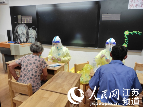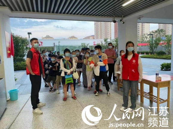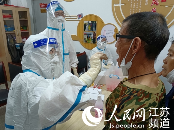 在东屏街道徐溪社区核酸检测点,扶老携幼的居民正在进行核酸检测。医务工作者、社区网格员、红马甲志愿者在现场一同维持秩序。据了解,东屏街道设置了10个核酸检测点,共有500多名工作人员参与其中。