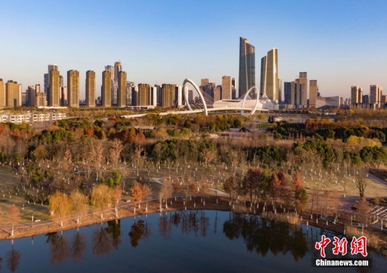 12月23日,航拍位于长江中的南京建邺区江心洲青奥森林公园冬日景致。该公园以森林为特色、以青奥为主题,设计贯彻以人为本的理念,体现“野趣入城,城市田园”的整体景观风貌。泱波 摄
