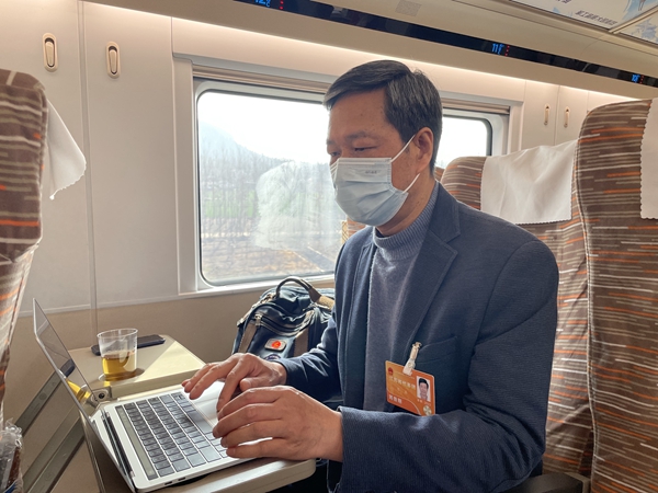 赴京参会途中,全国人大代表、南京市第一医院副院长陈鑫抓紧时间修改建议。鹿伟摄