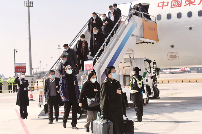 3月3日,出席全国政协十三届五次会议的江苏地区全国政协委员乘飞机抵达北京。 本报记者 余萍 摄