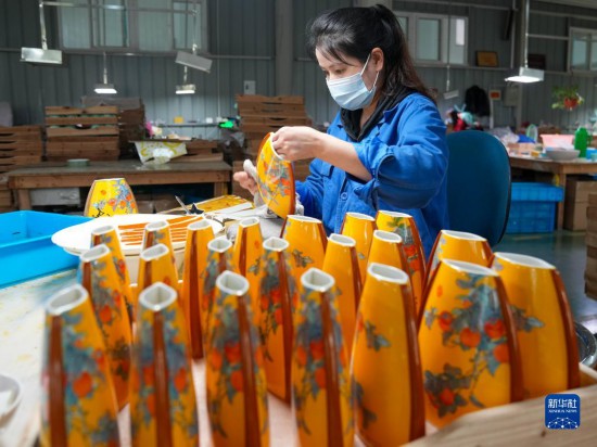 在江苏高淳陶瓷股份有限公司生产车间,工作人员给陶瓷产品贴花(5月12日摄)。