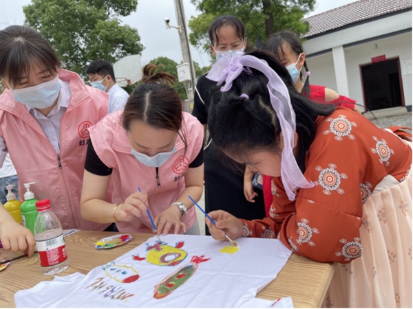 这次志愿行动中,志愿者们还带着村里的孩子们来到阳江镇潦田村参加“彩绘快乐童年”活动。小朋友们用画笔在白色短袖上创作载人火箭发射、保护生态环境、关爱未成年人等主题图案,写下自己的梦想。此外,还开展了《中华人民共和国未成年人保护法》知识抢答和亲子包粽子比赛等互动活动。