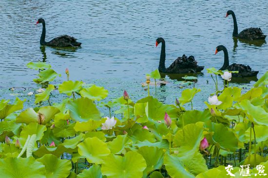 片片荷叶之间,黑天鹅优雅自在戏水,绘就一幅人与自然和谐共处的美好画卷。(蒋文超)