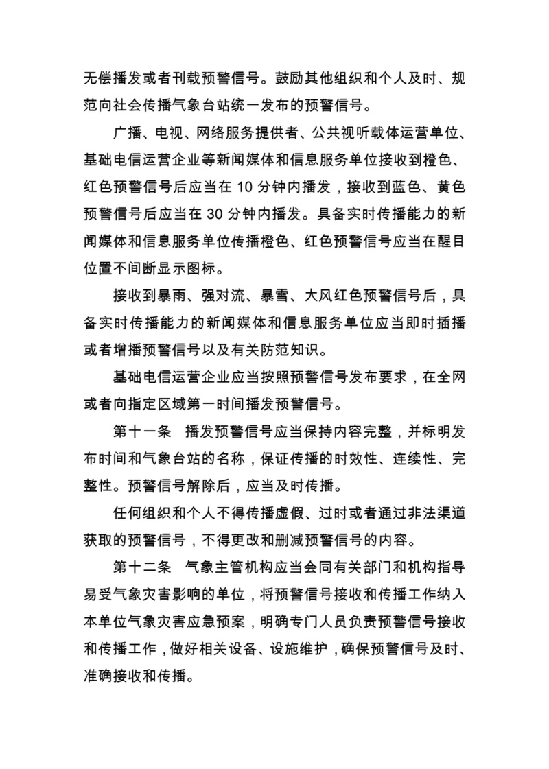 《办法》规定,预警信号由气象台站统一向社会发布,其他组织和个人不得向社会发布。气象台站应当按照本省设置的标准发布预警信号,并及时更新或者解除预警信号,同时报告本级人民政府、通报有关部门和机构。为确保预警信号广泛传播,地方各级人民政府、有关部门和机构接收到预警信号后,应当及时采取有效措施,开展必要的处置工作。各类新闻媒体和信息服务单位应当建立预警信号快速发布通道,及时、准确、无偿播发或者刊载预警信号。