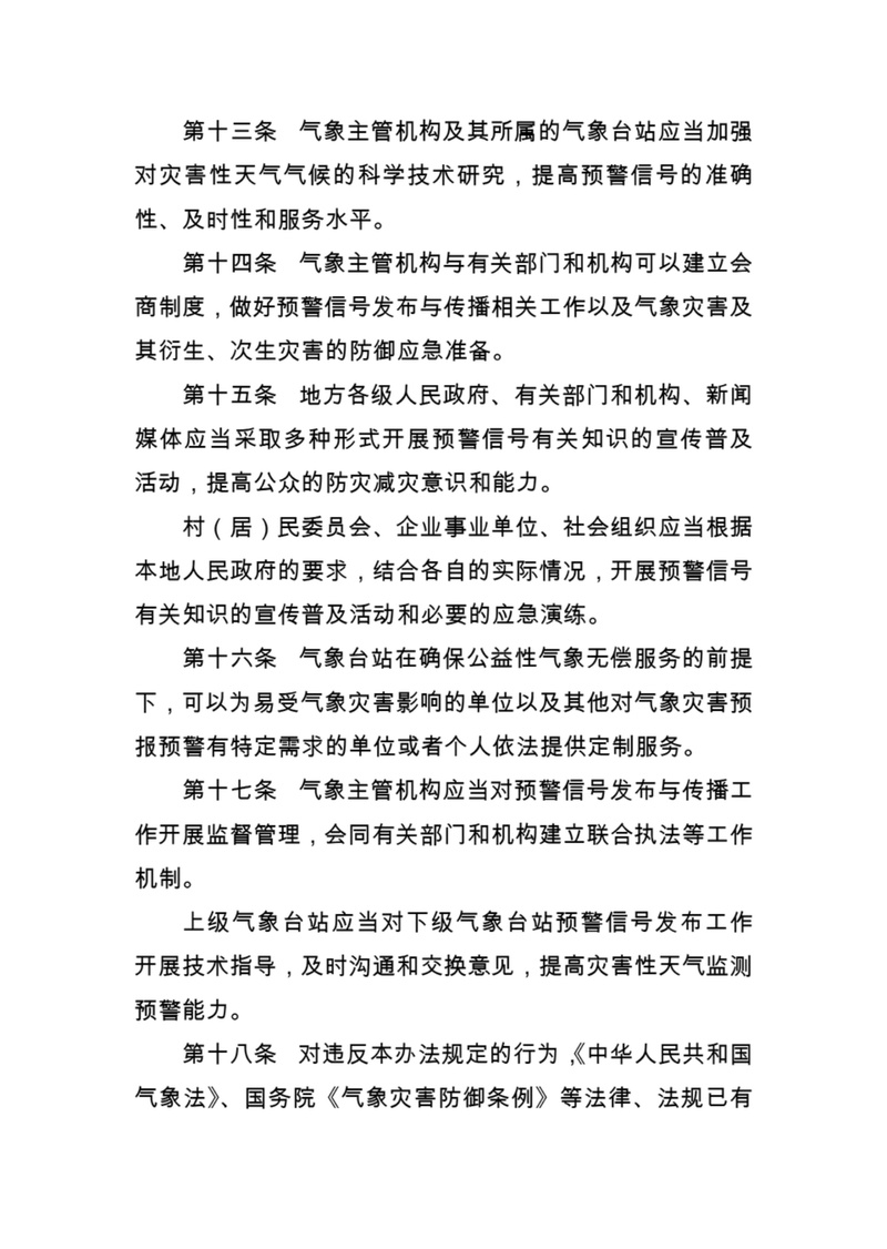 《办法》共20条,明确了预警信号的种类、级别、发布规范、传播要求以及保障措施和监督管理等内容。其中,预警信号主要包括台风、暴雨、强对流(含雷电、冰雹、龙卷风等)、暴雪、高温、寒潮、大风、大雾、霾、道路结冰等。预警信号的级别依据气象灾害可能造成的危害程度、紧急程度和发展态势划分为一般、较重、严重、特别严重,依次用蓝色、黄色、橙色和红色表示。