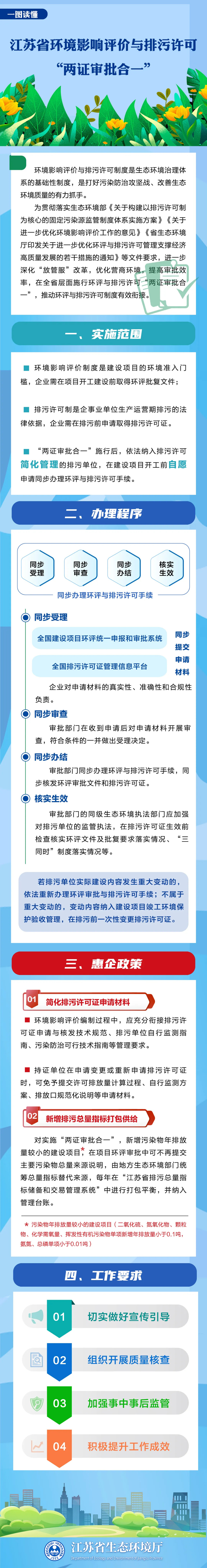 其中,为优化环评与排污许可制度改革措施,江苏将实施环评与排污许可“两证审批合一”,推动环评与排污许可制度有效衔接。具体来说,对排污许可简化管理企业,可在建设项目开工前自愿同步申请办理环评与排污许可手续,实现同步受理、同步审查、同步办结、核实生效。简化企业排污许可证内容、变更管理程序,减轻企业负担。开展工业园区排污许可“一张证”管理试点,优化排污总量指标动态高效配置。