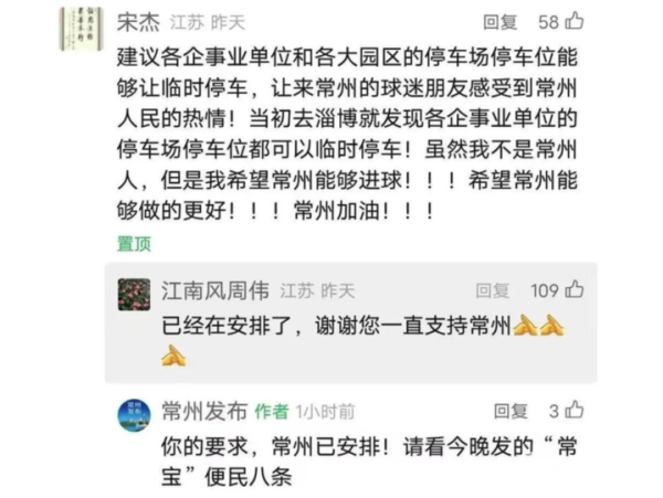 球迷在官微评论区建议常州“开放停车位”,市长周伟亲自下场秒回复:“已经在安排了,谢谢您一直支持常州。”这向来被网友奉作“搞抽象”的一幕竟真实出现在“苏超”第七轮开战前夕。网友们不仅被政府“秒级响应”所惊艳,短短24小时后该条建议更被火速“列入”保障事项——“常宝八条”上线:5000 个免费车位、公交地铁三天免票,甚至连宠物托管区都安排上了!这是堪比网络段子的“神回复”恰恰揭开江苏“十三太保”城市拉开阵势竞相花式“宠粉”的一隅。