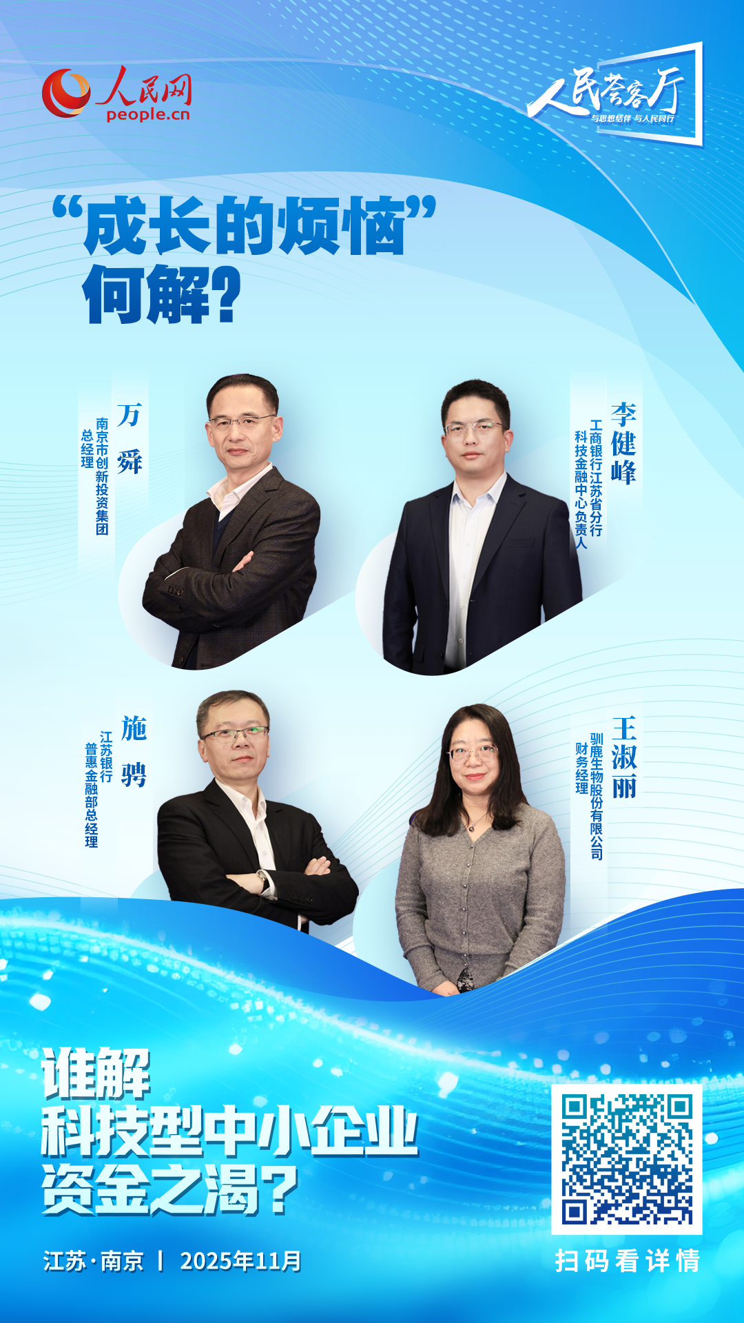 11月13日,人民网江苏频道打造的“人民荟客厅”圆桌会在南京举办,本期主题为“谁解科技型中小企业资金之渴”,在“聚焦成长期企业,提供立体化服务”分主题讨论中,来自金融机构、投资机构、科技企业的代表进行了对话交流。