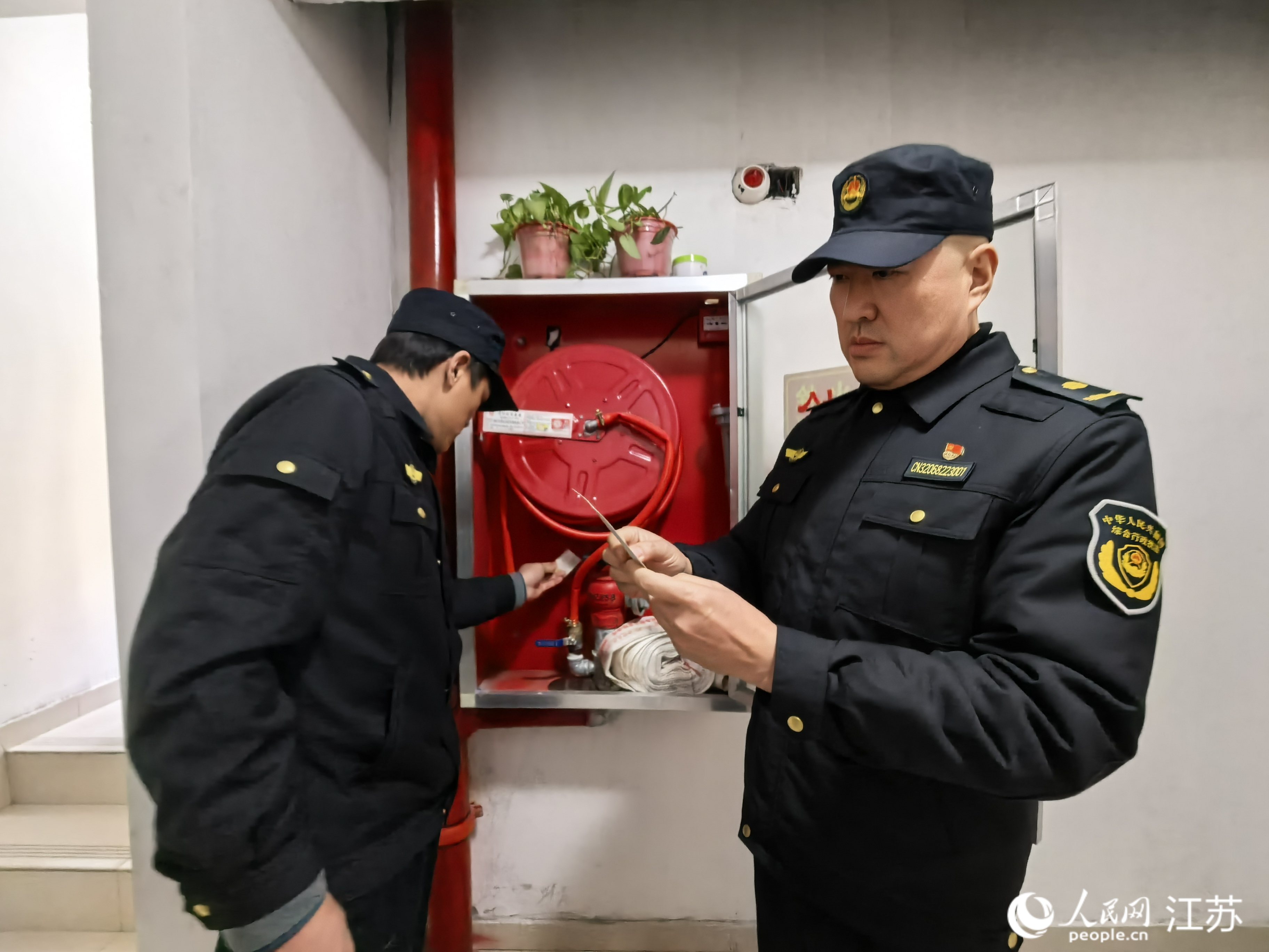 城南街道综合行政执法和安监管理办公室工作人员巡查小区消防设施。人民网记者 王继亮摄