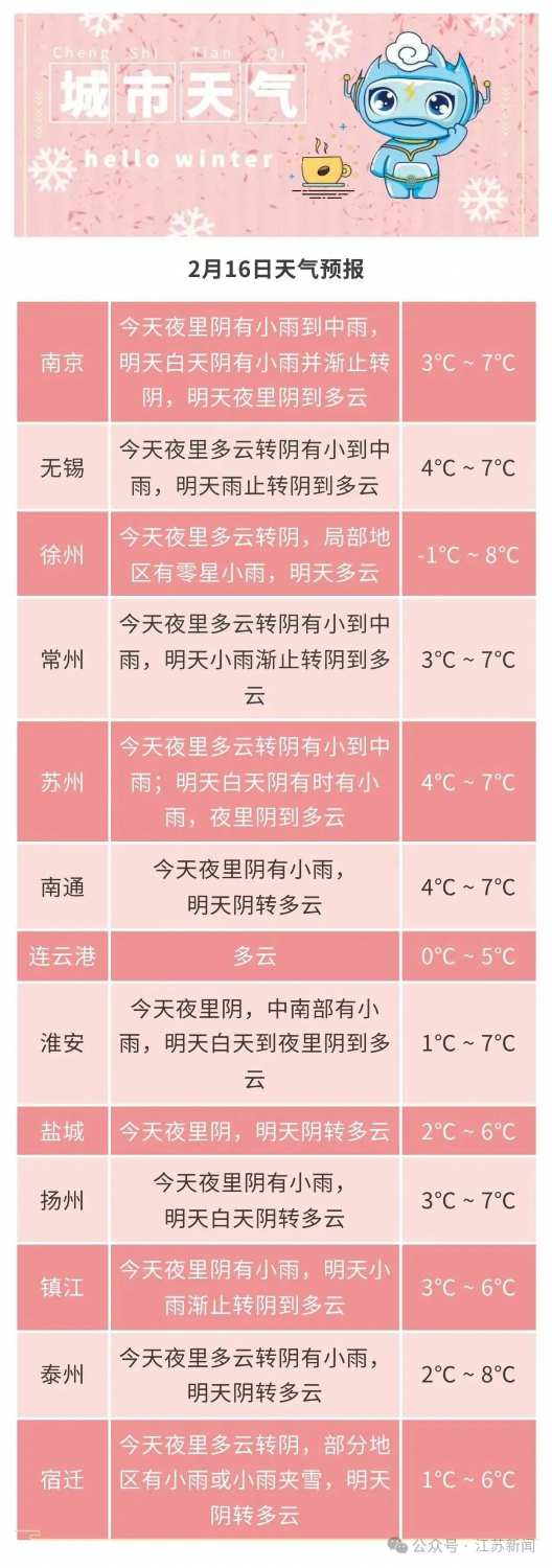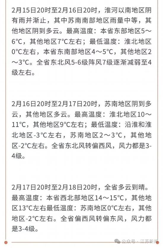 从2月15日起,有一次较强冷空气东移南下,江苏全省48小时最低气温降幅在6~8℃。今天白天苏南地区有小雨天气并渐止,其他时段全省以多云天气为主。