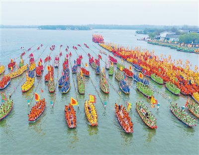4月6日,2026泰州姜堰溱潼会船节在江苏省泰州市姜堰区溱湖国家湿地公园开幕,数百条各式船只和上万名会船选手飞篙走桨,奋勇争先。