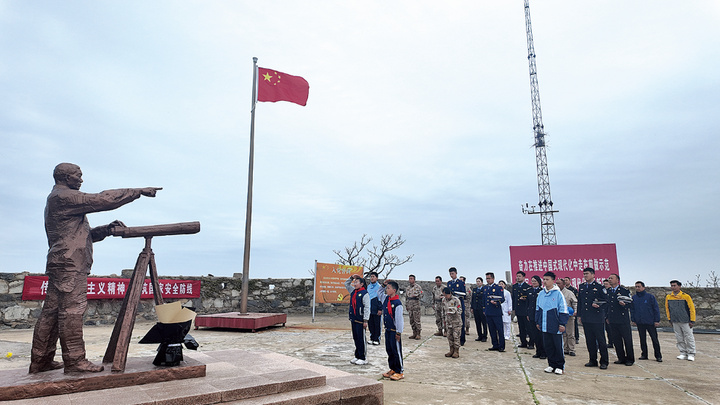 在开山岛国旗台,守岛民兵主持升旗仪式,全体人员肃立敬礼、齐唱国歌,重温王继才同志32年每日升国旗的守岛初心,感悟“守岛就是守国、升旗就是铸魂”的精神内核。两名学生代表向王继才雕像敬献鲜花,全体人员跟随守岛民兵重走208级巡岛石阶。沿着开山岛环岛“英雄之路”,守岛民兵一路讲解王继才夫妇巡岛查哨、观测海情、应对台风等真实经历,全体人员共同体验“脚踩礁石、心系家国”的守岛状态,并到“海魂书屋”签字打卡。